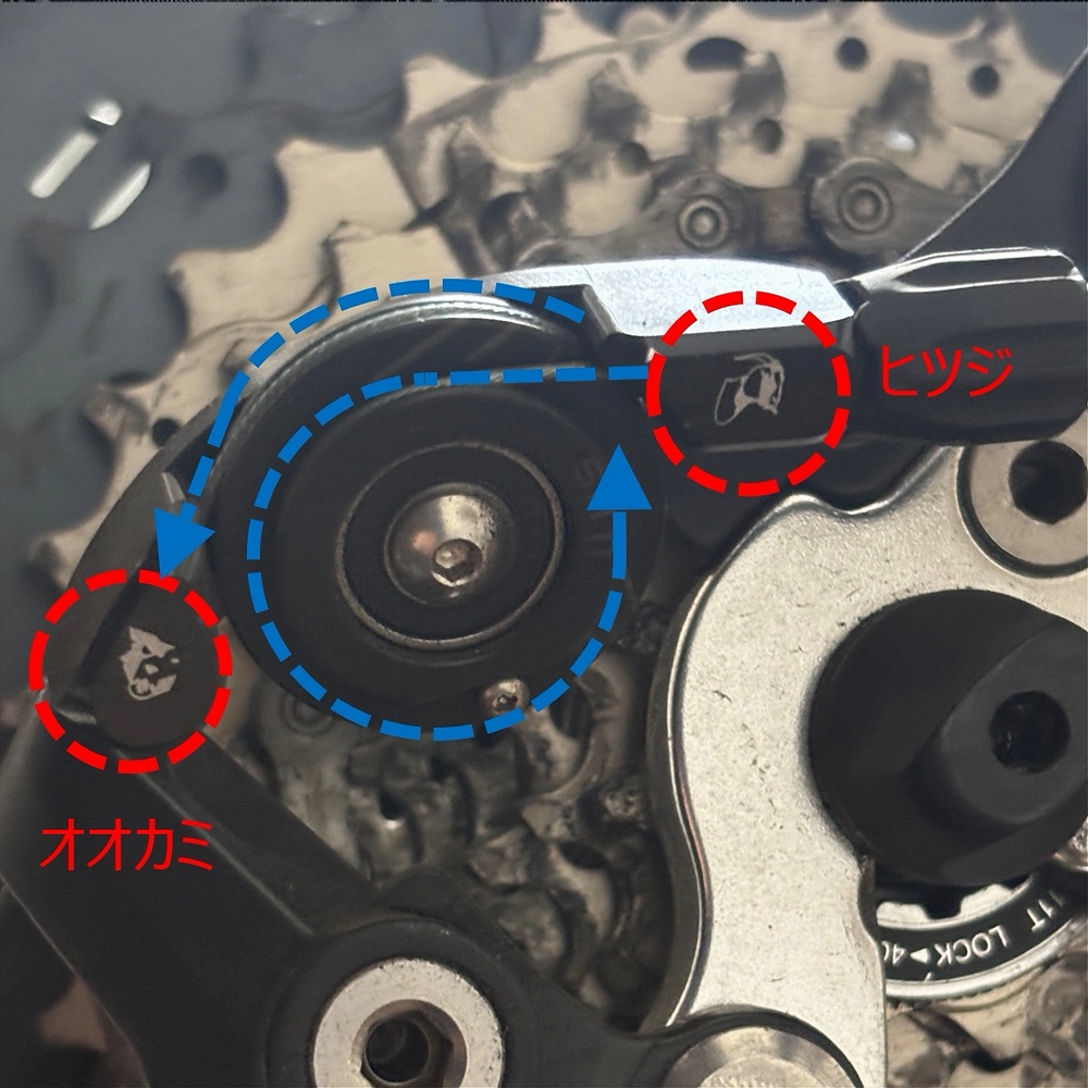 ヒツジのイラストが描いてある方がシフター側、オオカミのイラストがある方がディレイラー側です。