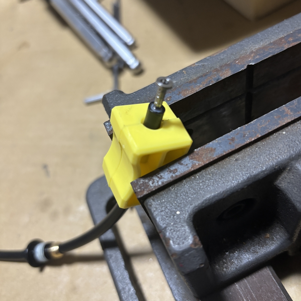 キャリパーを仮固定して、ホースの長さを決めたら、カッターでカットして、先端にコネクティングボルト、オリーブを挿入後、コネクターインサートを打ち込みます。