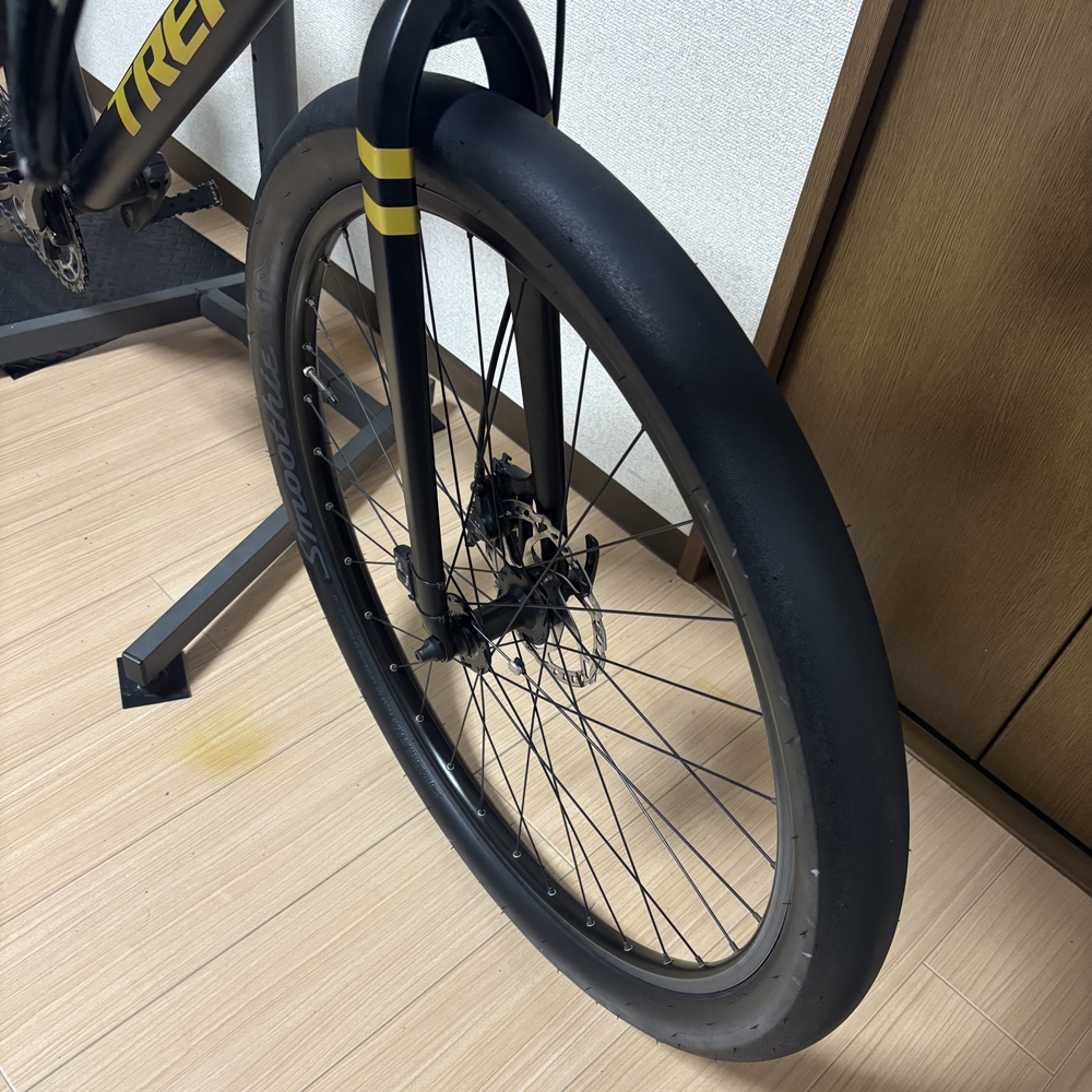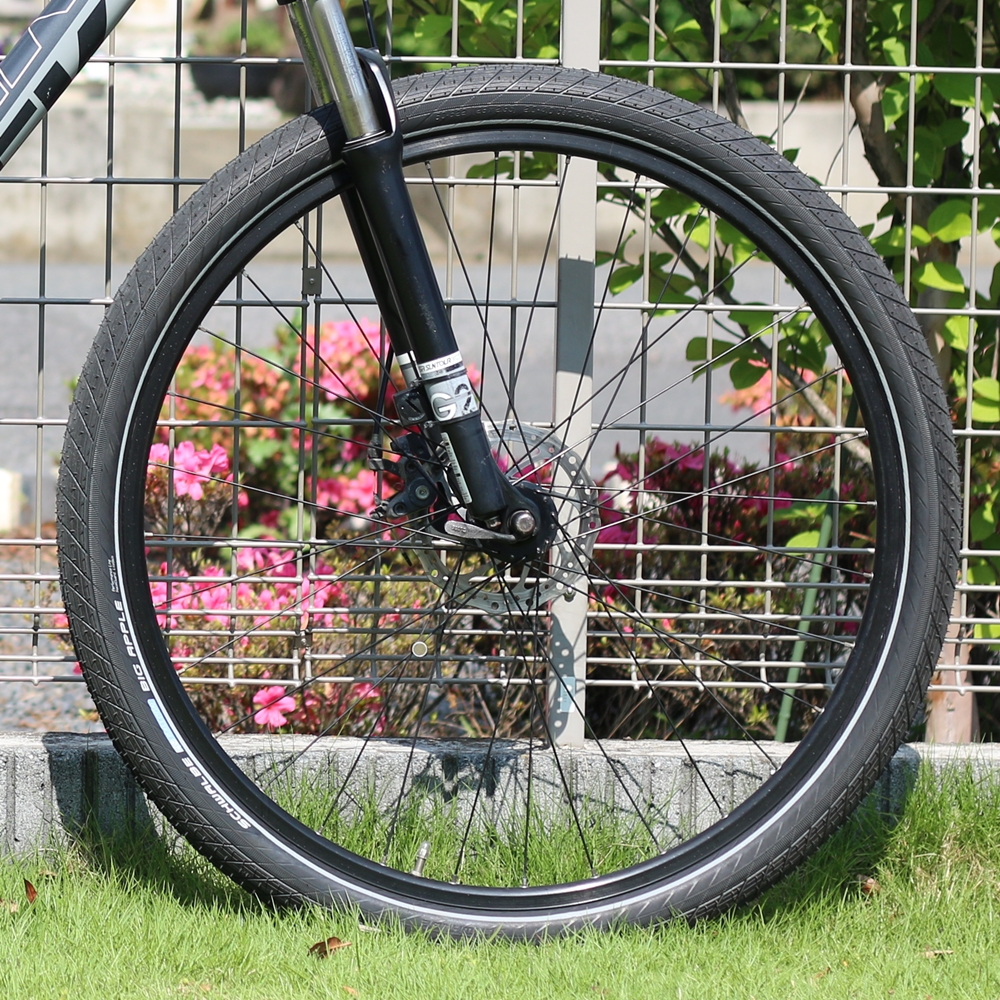 2.5インチ幅で、けっこう重たいのですが(多分1kgくらい)、スリックタイヤは接地面のブロック抵抗が少ないため、重くても転がりは軽く感じます。